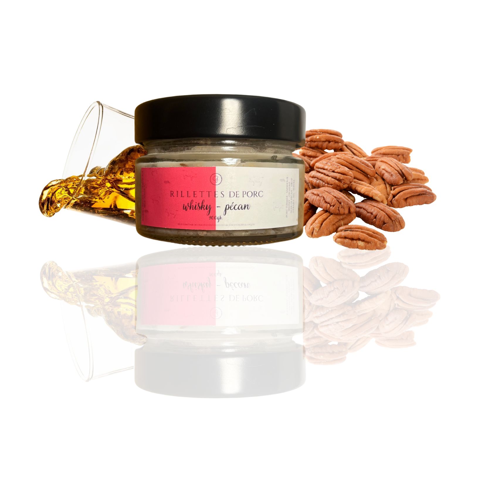 Laissez-vous séduire par l’alliance audacieuse et gourmande de notre rillette de porc artisanale, délicatement parfumée au whisky et sublimée par le croquant des noix de pécan.